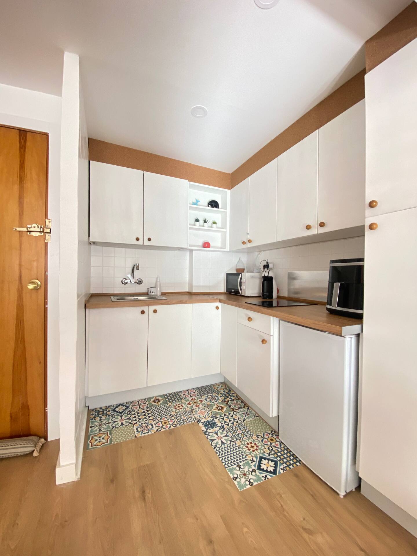 - Espacio abierto de salón y cocina; dispone de vitrocerámica, nevera y menaje de cocina completo.